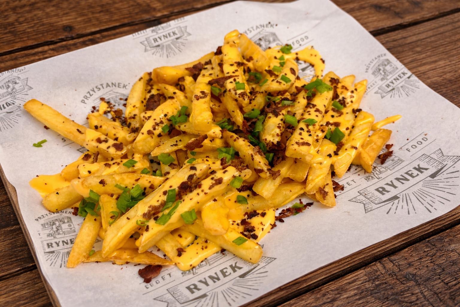 chrupiące frytki oblane aksamitnym sosem truflowym, posypane serem Grana Padano, prażoną cebulką i pietruszką. Luksus w wersji street food.